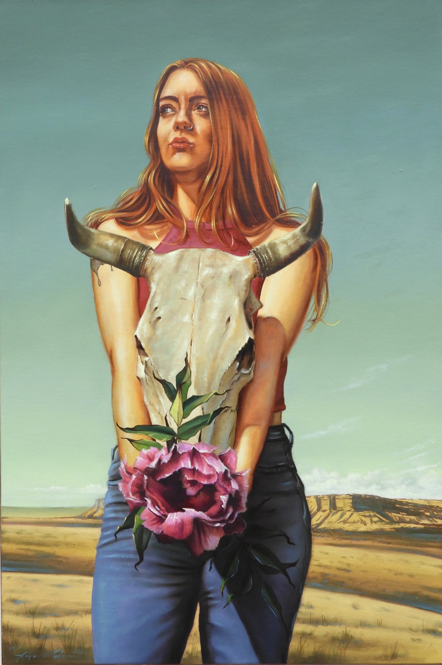 Then,- just like that - thirty years had passed and now Jade was looking at the dusty old skull on a rusty old nail in my dusty old studio . She really liked Georgia's work and had wanted to use some of these things in her work, large flowers, skulls , stripped-back backgrounds , floating elements. When she had all the components together it made sense to me, her referencing Georgia , the elements living again. i thought of the old Kodachrome colours , saturated with greys. I had been thinking of the 1930s and I had been thinking of New Mexico, but mostly I had been thinking of Georgia O'Keeffe , the mother of modernity